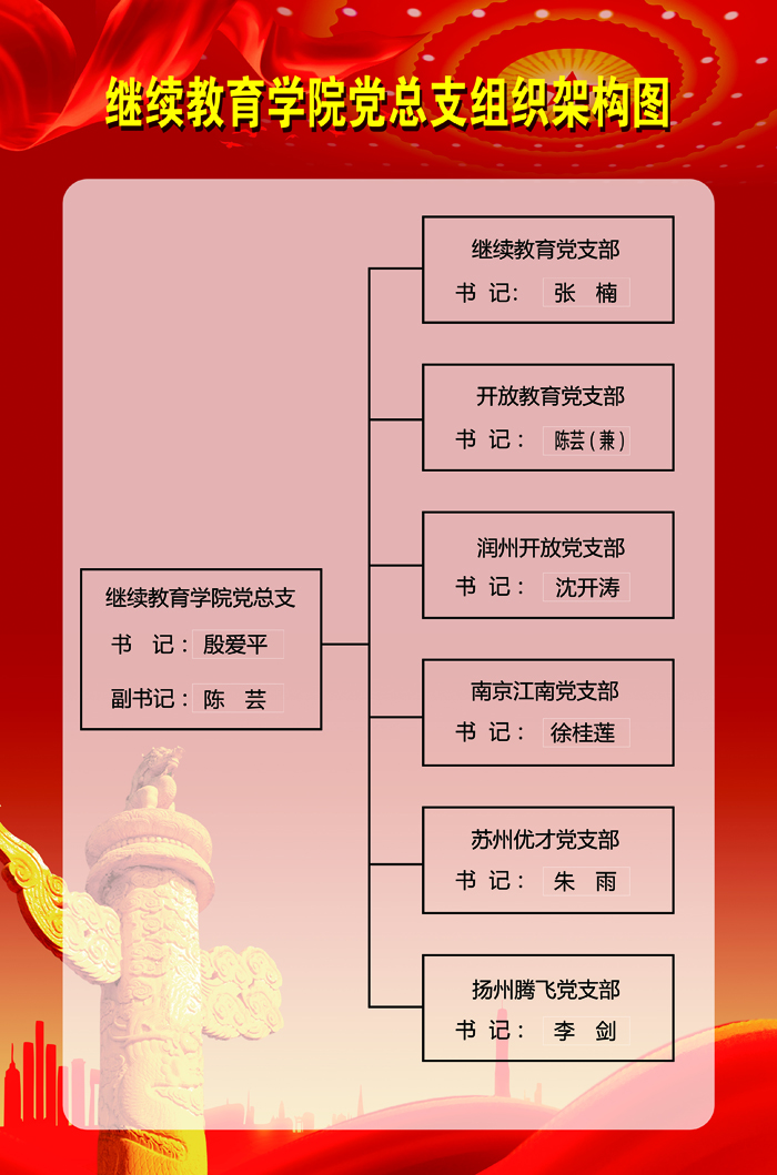 公司党总支共有教师党员14名,支委5人,书记:殷爱平;副书记:陈芸;组织委员:张楠;纪检委员:刘松;宣传兼统战委员:钱亮,下设继续教育党支部、开放教育党支部两个党支部,分别由张楠、陈芸兼任支部书记。同时根据思政教育的要求,结合党建创新,党总支又下设了南京江南党支部、润州开放党支部、苏州优才、扬州腾飞党支部四个员工临时党支部,支部书记由教师担任,旨在加强公司党总支对学历教育员工党员的教育、管理,强化监督激励机制,党总支参与学历教育员工思政教育工作等方面。